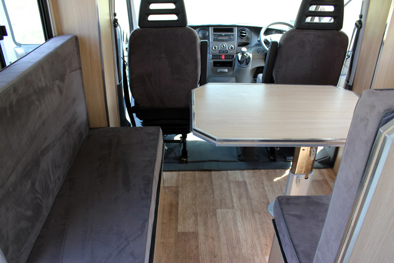 The dinette table is fully adjustable and can move forwards, backwards and side