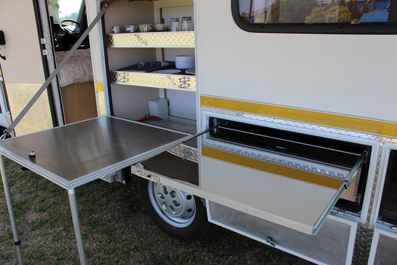 This kitchen compartment is accessible from outside and inside the camper.